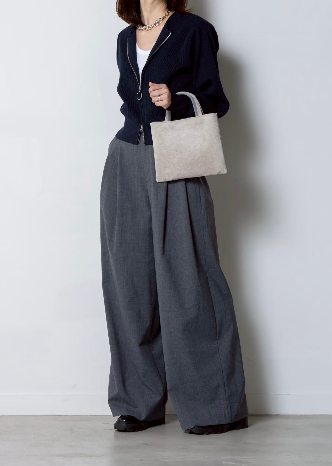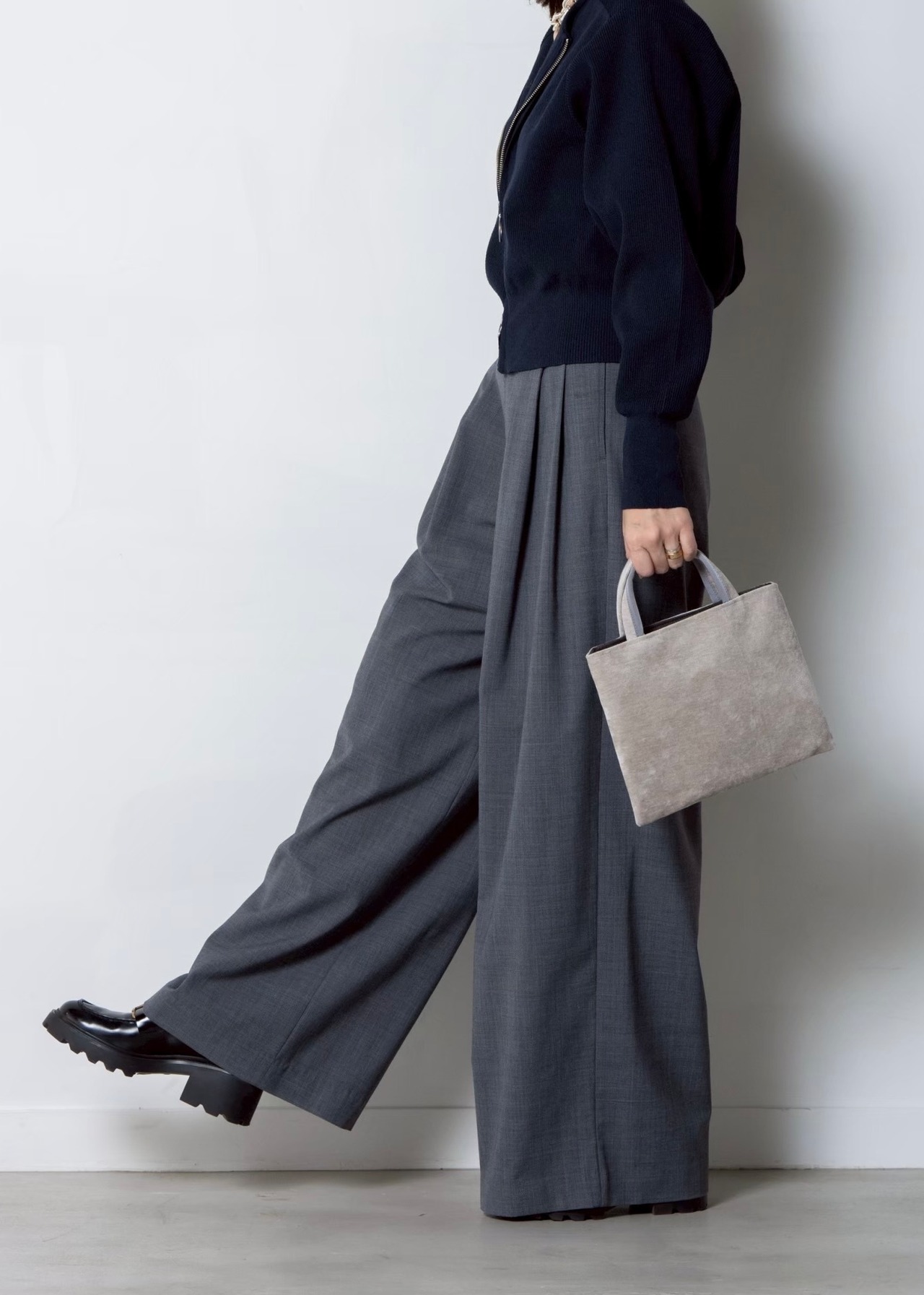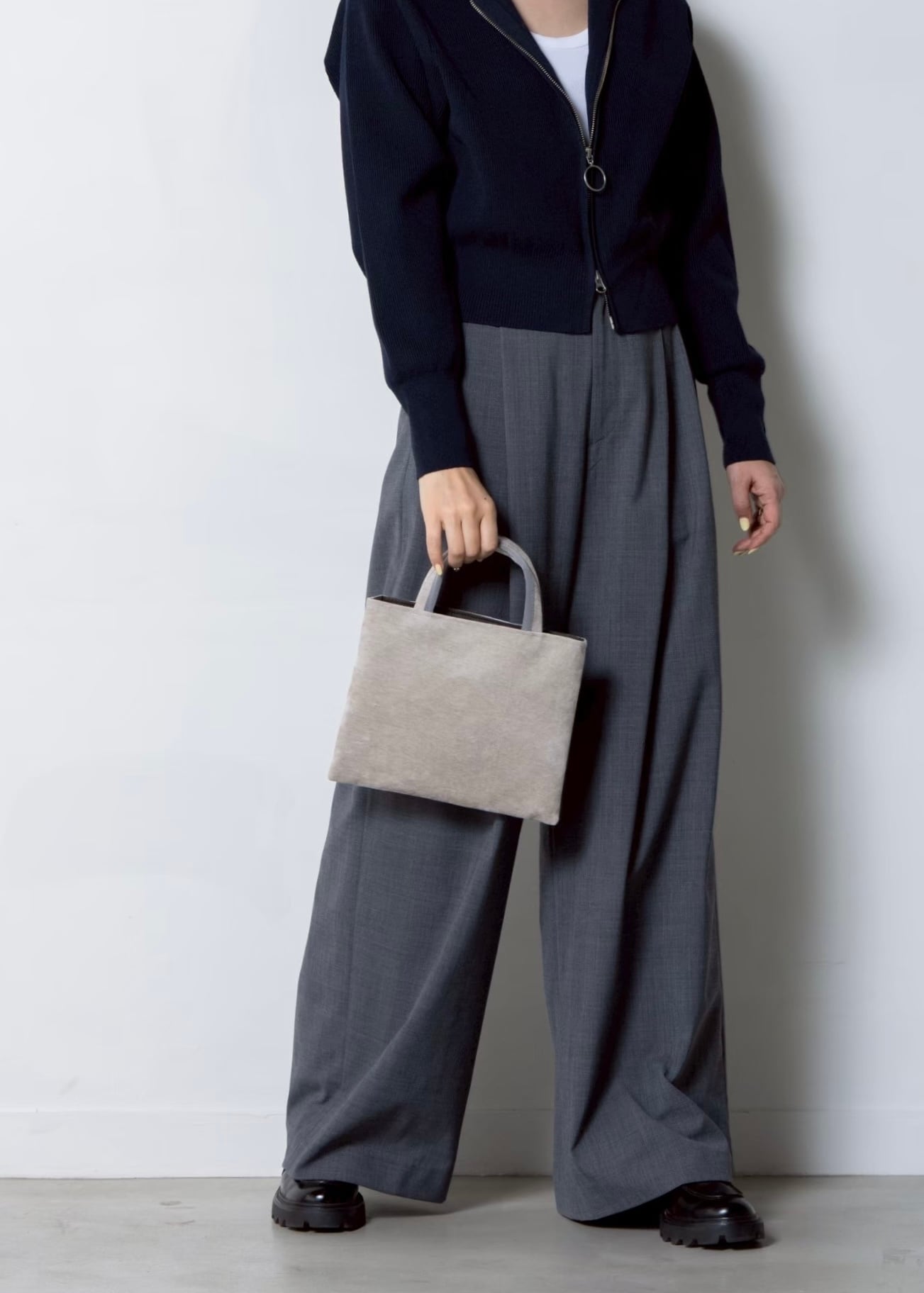 季節問わず年中持てる、ベルベットより毛足の短いお上品な風合いの生地。光や角度によって表情を変えるエレガントな印象。日々のコーデに溶け込むグレーカラーです。