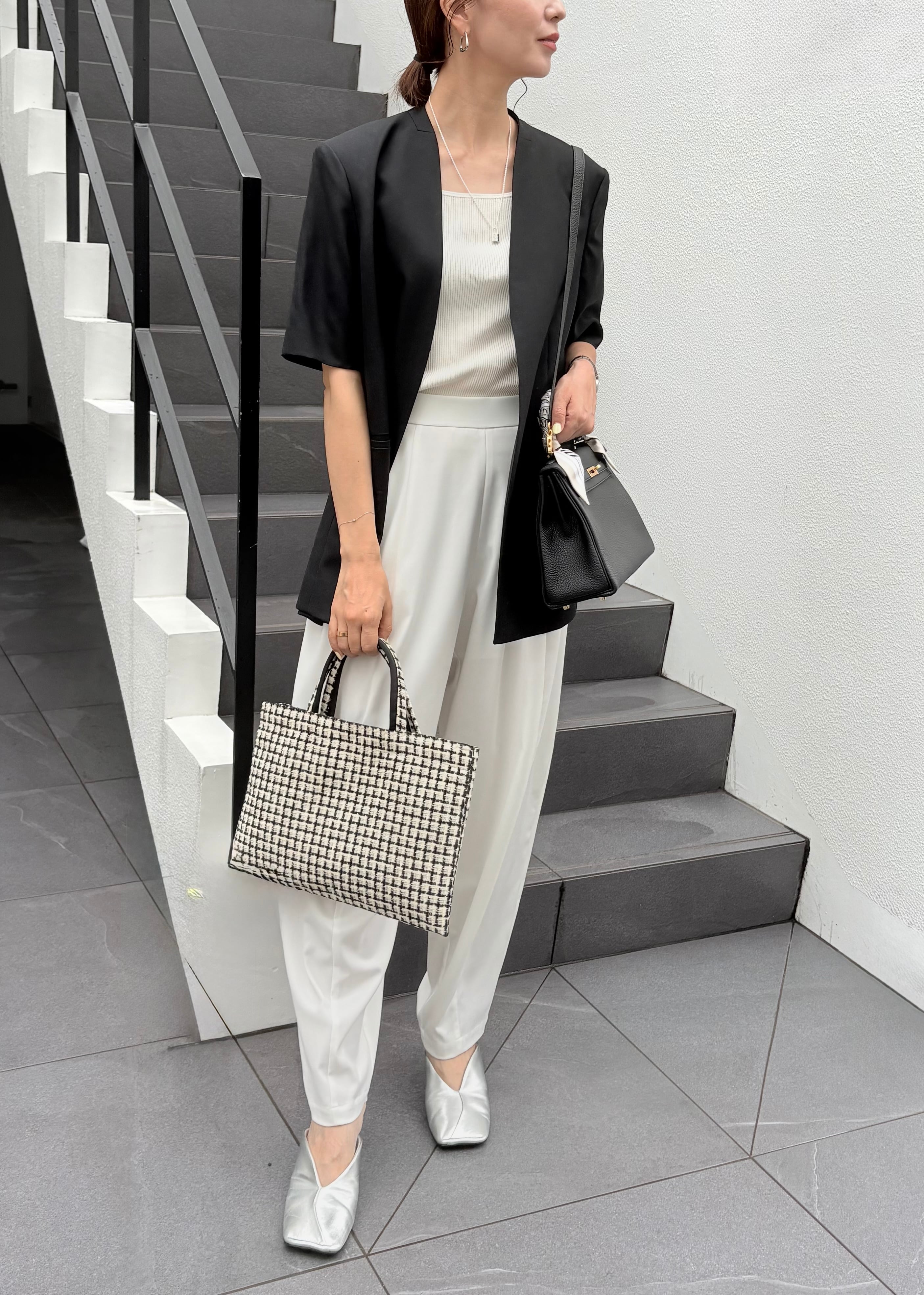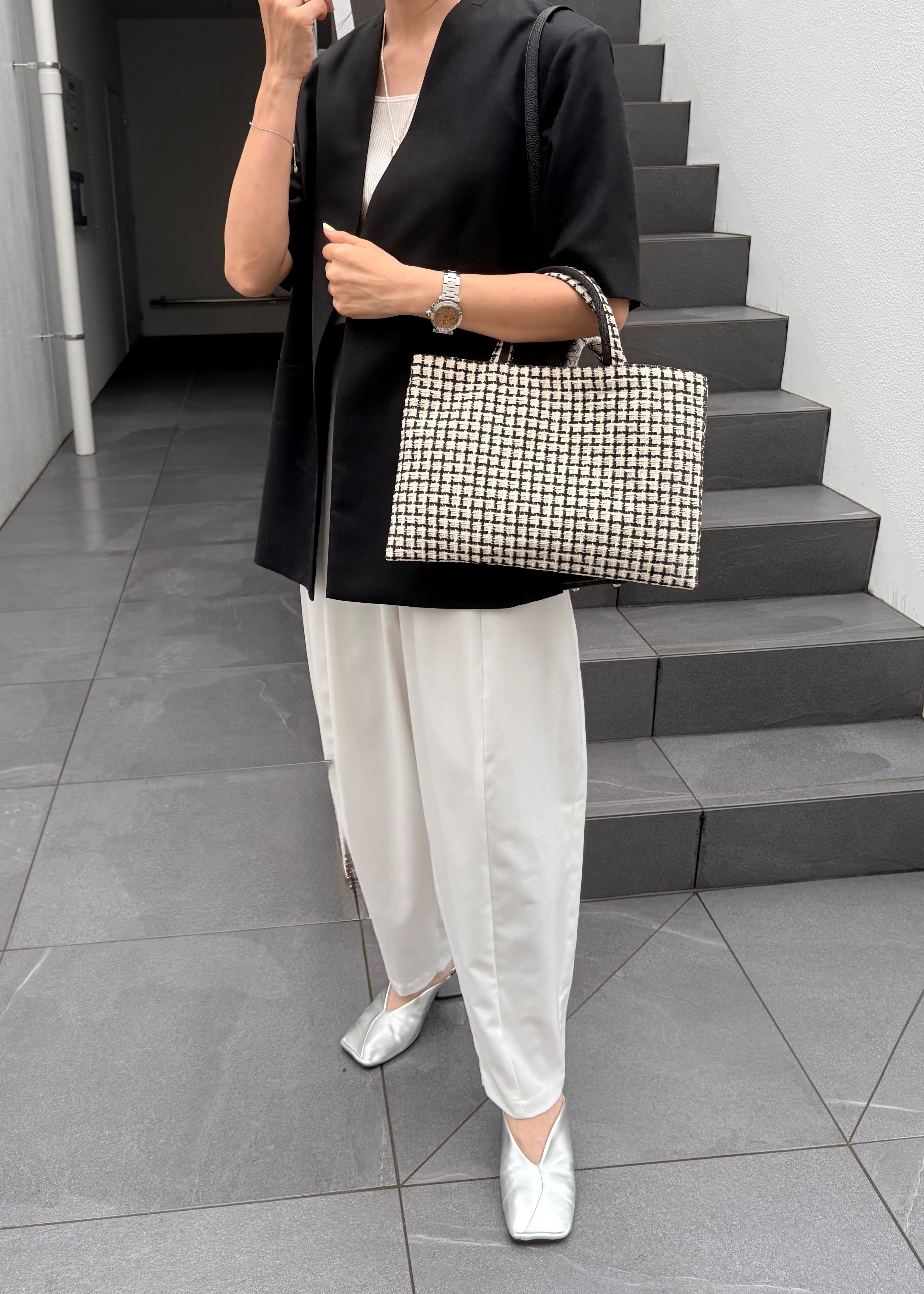 Black Whiteの格子柄を表現している独特の立体感が美しいファンシーtweed。所々ラメ糸が織られており表情を変えます。クラシカルな印象でオケージョンにはもちろん、キレイめからモードまで幅広いスタイリングに取り入れやすい仕上がりです。