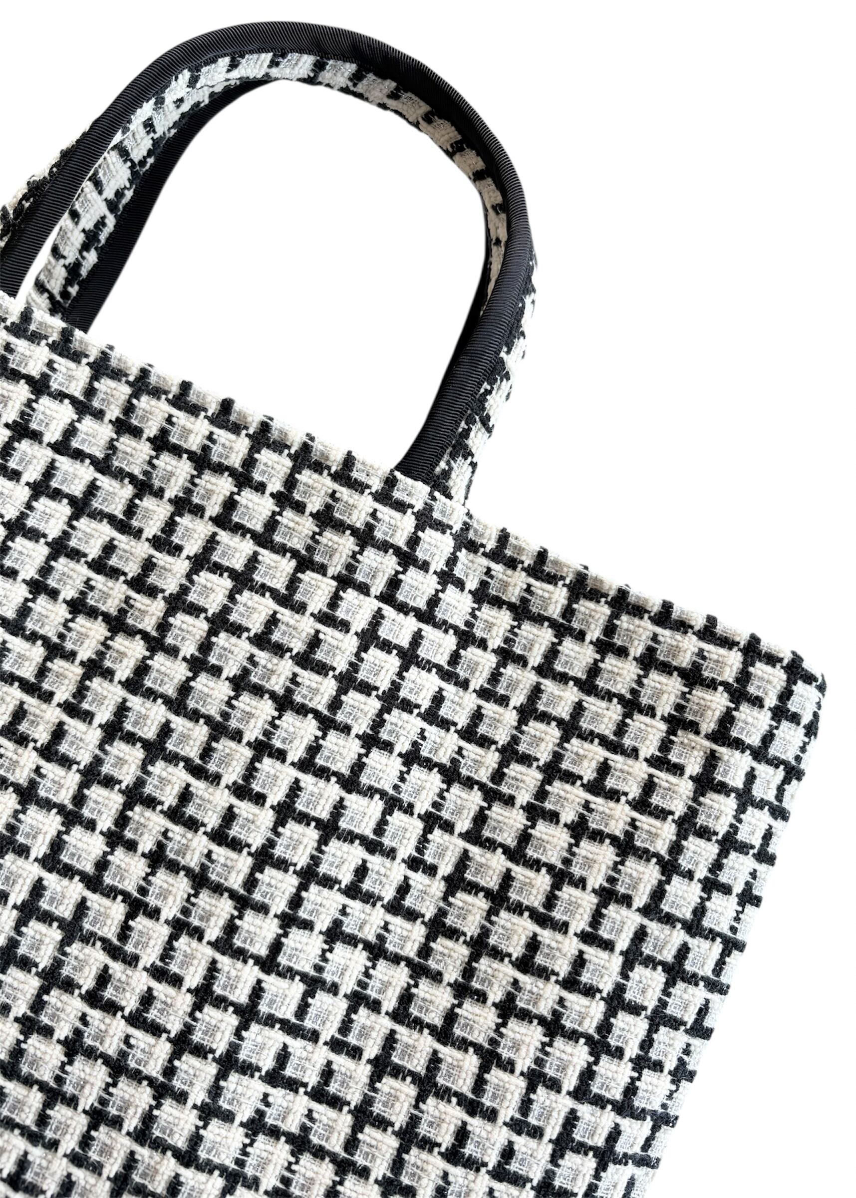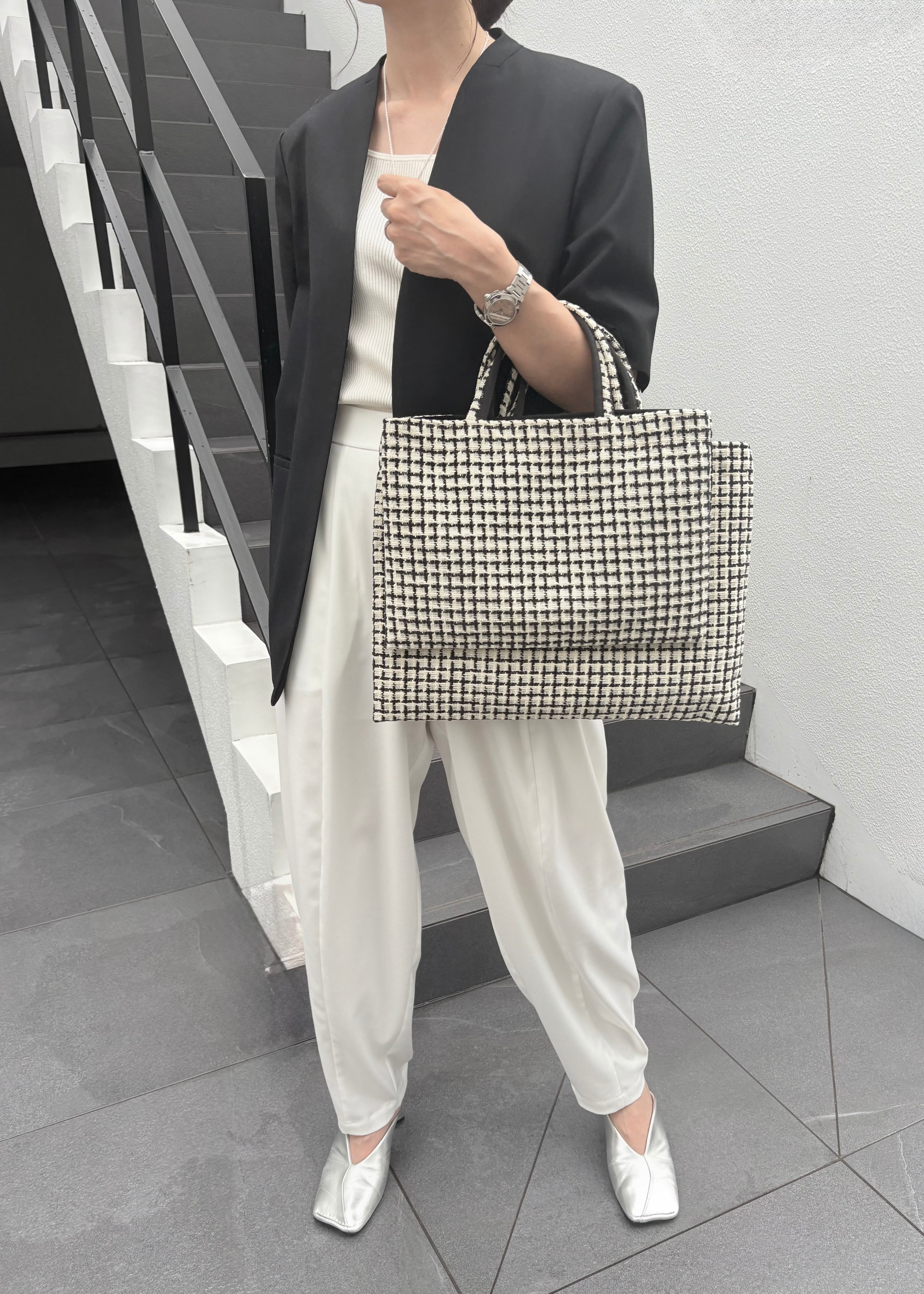 Black Whiteの格子柄を表現している独特の立体感が美しいファンシーtweed。所々ラメ糸が織られており表情を変えます。クラシカルな印象でオケージョンにはもちろん、キレイめからモードまで幅広いスタイリングに取り入れやすい仕上がりに。