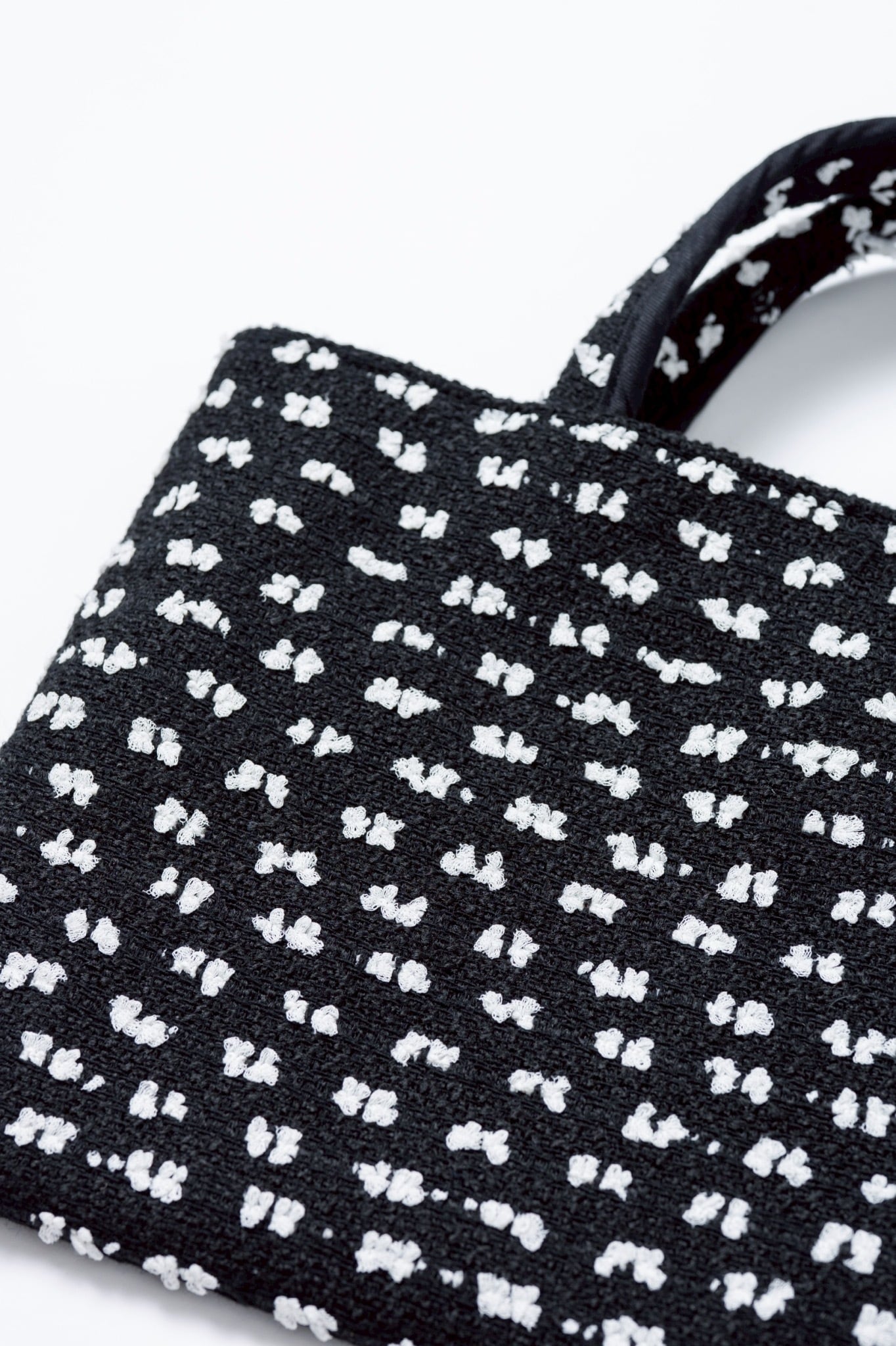 重厚感あるBlackのベース生地に、繊細に織り込まれたレースリボンモチーフが印象的なファンシーツイード。フェミニンにもカジュアルにも取り入れやすく、持つだけで華やかな印象に。