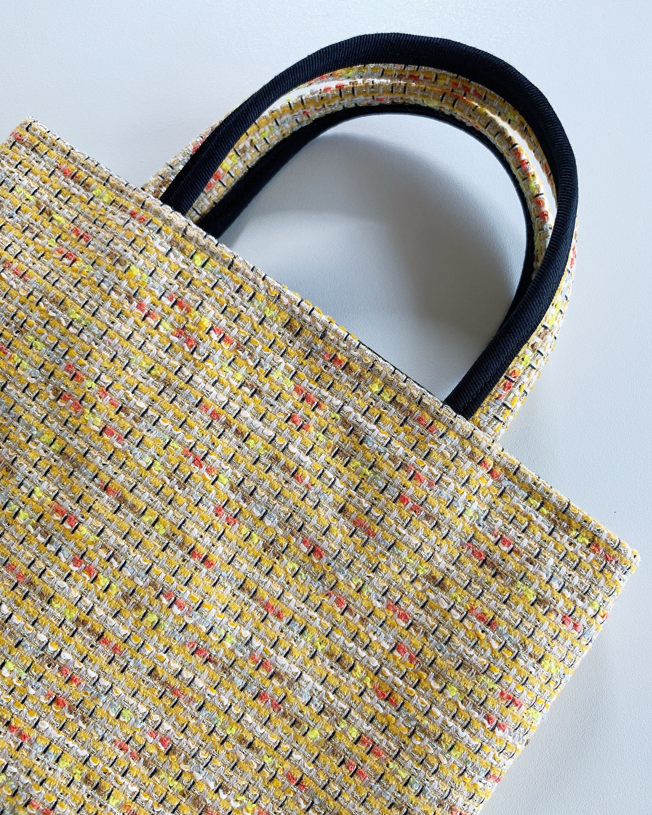 様々なカラーの糸が複雑に織り込まれている年中使えるコットンツイードを使用。どんなシーンにも溶け込みやすいイエローカラーのツイードは、独特の風合いが普段のコーデにエレガントな雰囲気をプラスしてくれます。