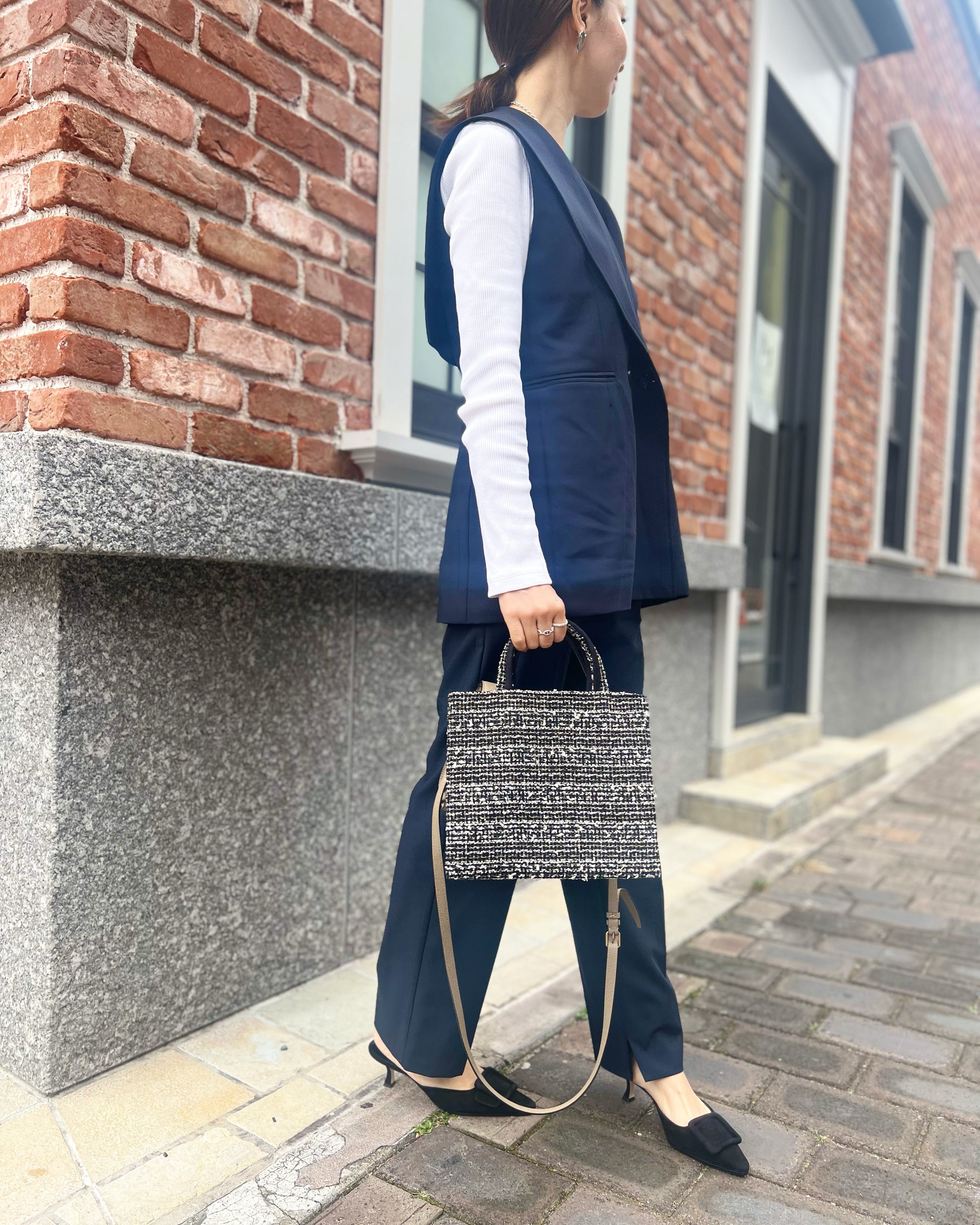 いつもしっくりくるベーシックカラー。黒と白。ベーシックだからこそ厳選したコットンツイードを採用しました。セレモニーはもちろん、どんなシーンにも溶け込みやすく一つは控えておきたい小さなBIBI bag.です。