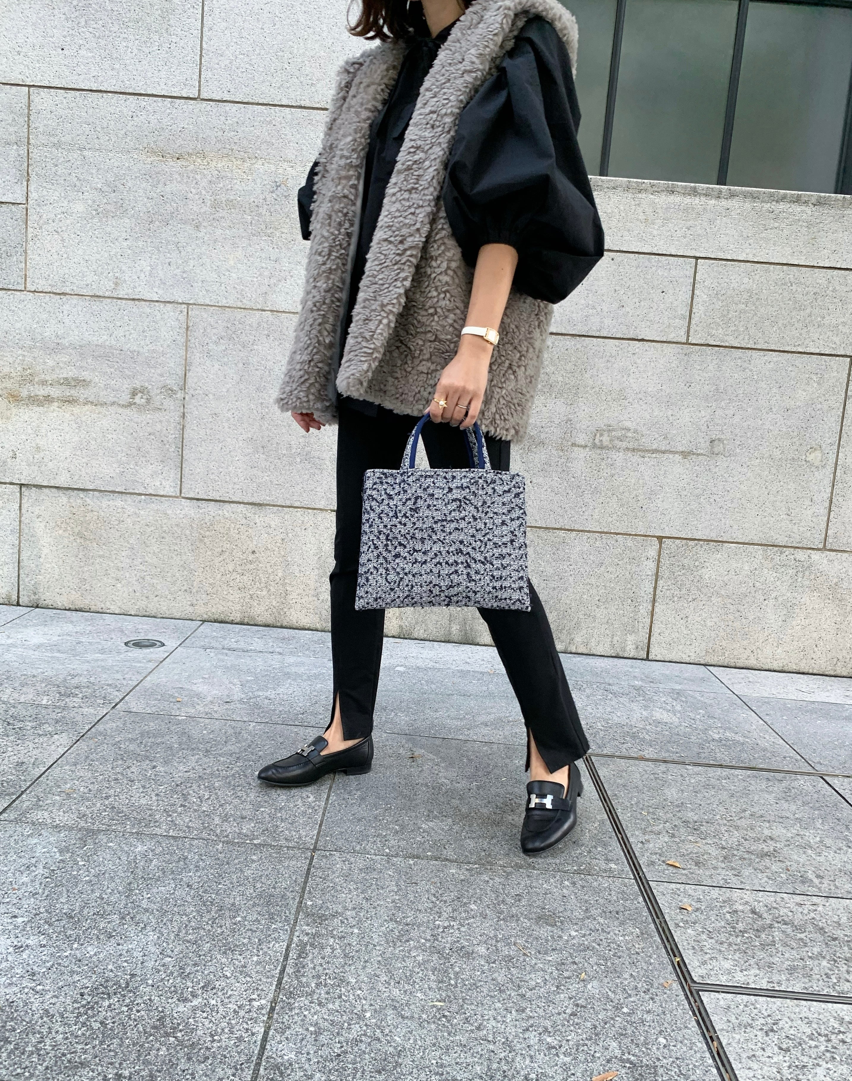 濃紺と白。さりげなくシルバーの糸が混ざり合う落ち着いた印象。美しい街並みに溶け込むシックなネイビーカラーはコーデを華やかにしてくれる一つは控えておきたいtweed素材の小さなBIBI bag.です。
