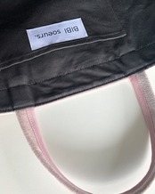取手にはBIBI bag.らしい光沢感のグログランパイピングを。ちらっと見える裏地はチャコールグレーのグログラン生地をたっぷり使用しました。適度な厚みとハリが特徴です。