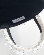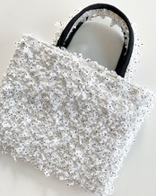 シルバーやベージュなどの様々な糸が織り込まれているホワイトベースの生地にドット柄のリボンヤーンが繊細に施されています。