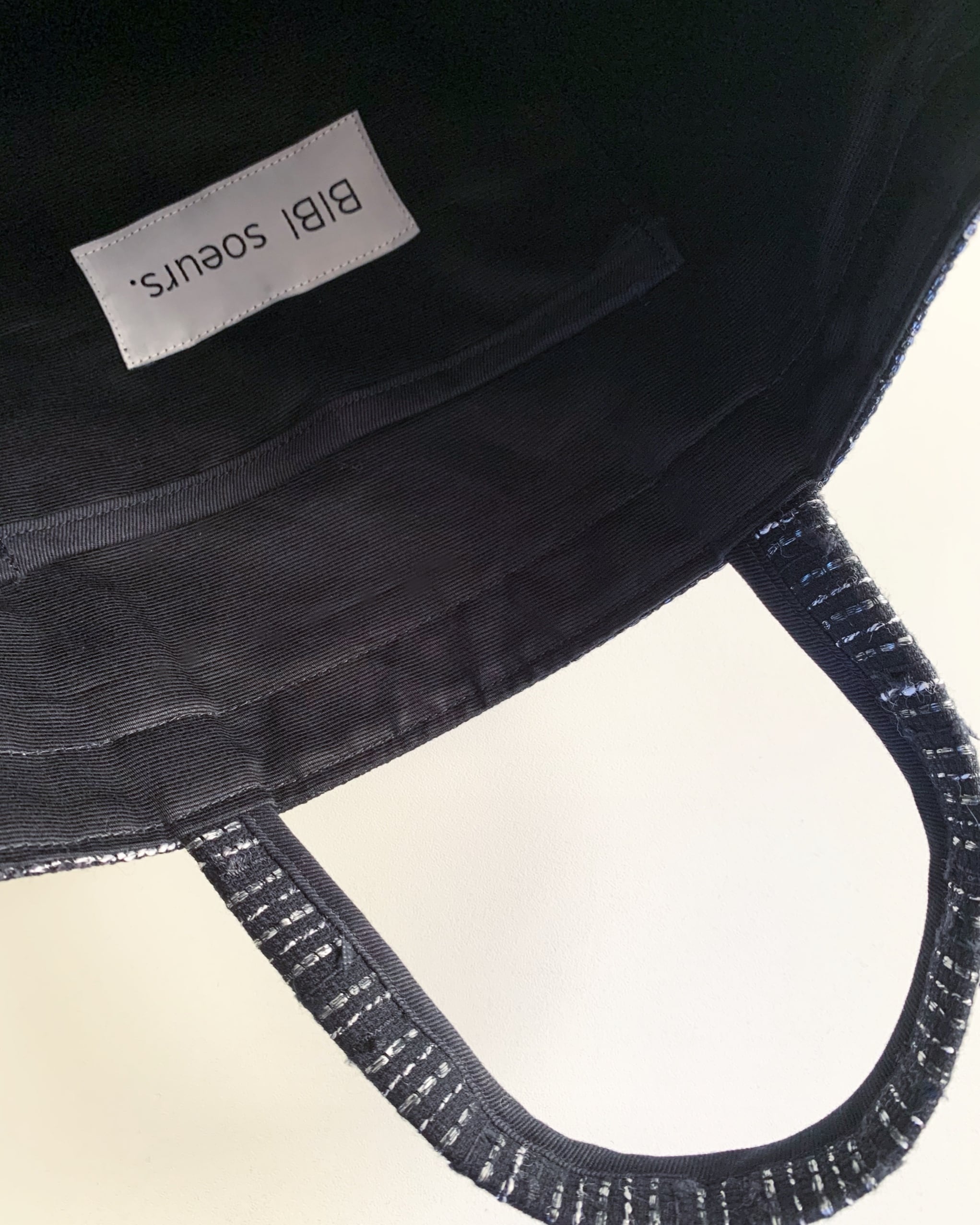 取手にはBIBI bag.らしい厚手のコットンパイピングを。ちらっと見える裏地はブラックのグログラン生地。適度な厚みとハリが特徴です。