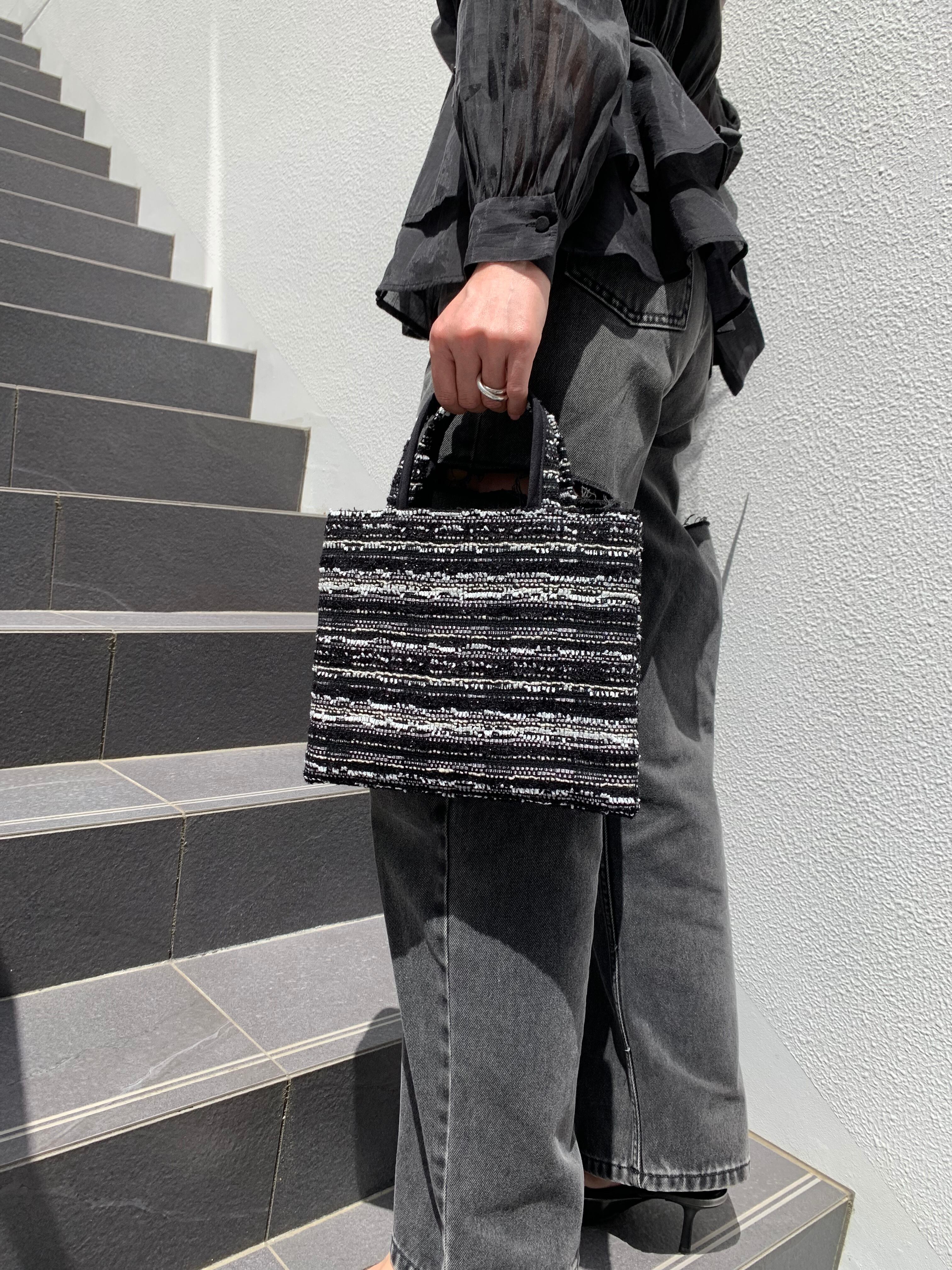 写真はサンプル品や実際に私物を入れ使用しているものを撮影しているため実物とは加工、縫製、タグ位置、サイズ等が若干異なる場合もございます。また、ツイード生地の特性上使用にあたりほつれなど生じる場合がございます。撮影時の光の加減や使用する生地部分の違いでデザインや色味が多少異なって見える場合もございます。予めご了承ください。