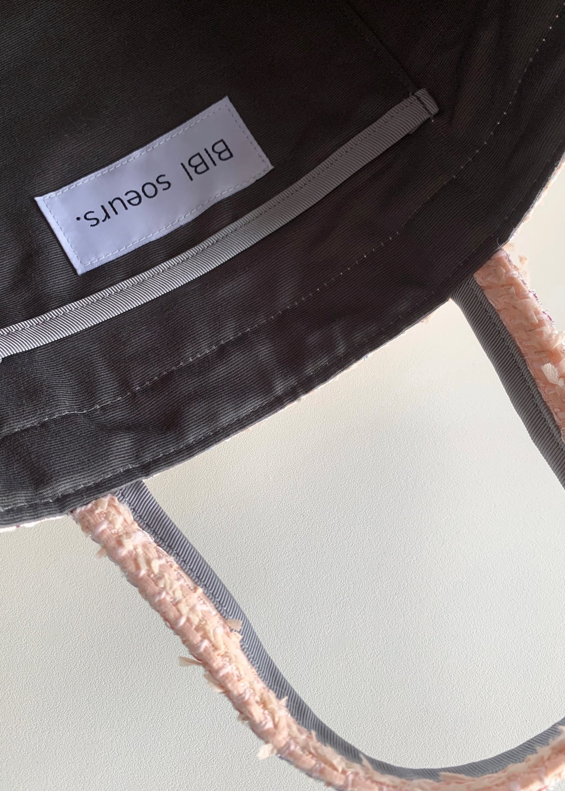 取手にはBIBI bag.らしい厚手で適度な光沢感のグログランパイピングを。ちらっと見えるインナーはチャコールグレーのグログラン生地。適度な厚みとハリが特徴です。