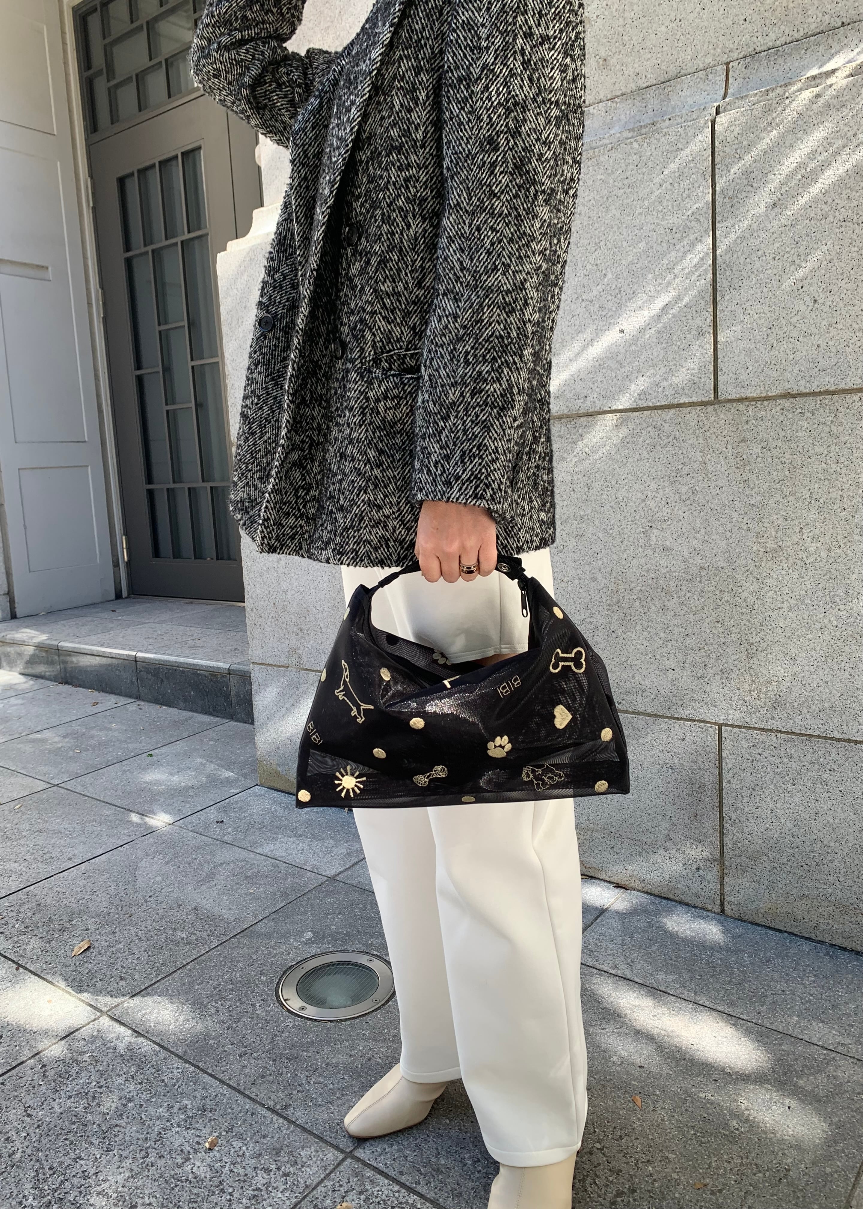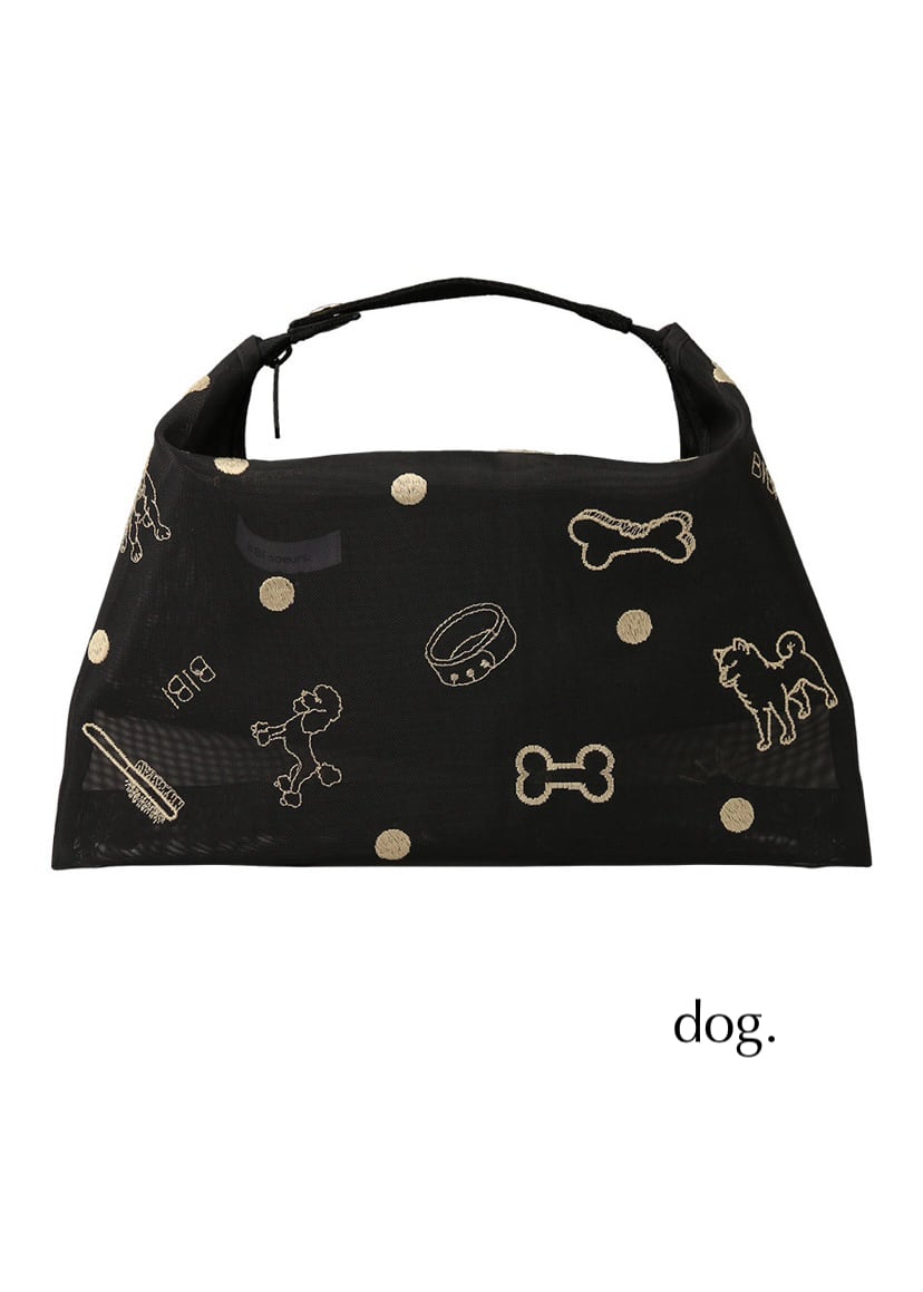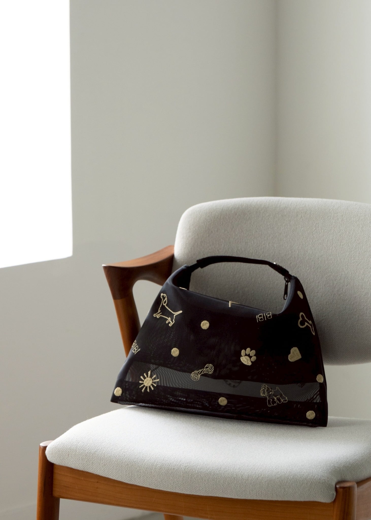ファスナーは開け閉めもスムーズな質の高いものを採用。メインの刺繍のテーマはhobbyとdog。キュートで遊び心のきいたメッシュバッグはすぐ側にいるときめくものを集めて気分が上がるよう心を込めて。刺繍糸の使用量を増やし立体感とボリュームのある風合いを実現。