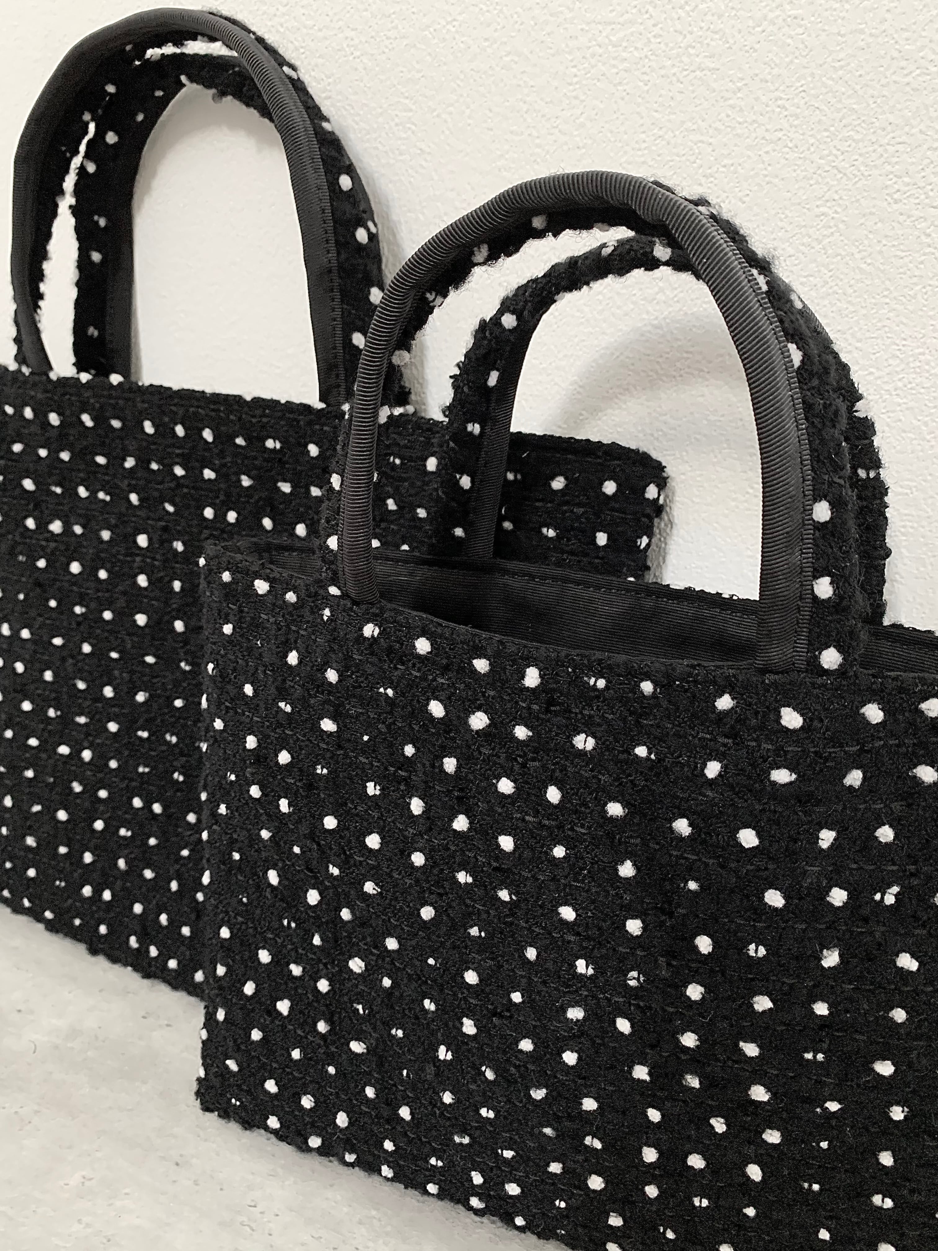写真はサンプル品や実際に私物を入れ使用しているものを撮影しているため実物とは加工、縫製、タグ位置、サイズ等が若干異なる場合もございます。また、ツイード生地の特性上使用にあたりほつれなど生じる場合がございます。撮影時の光の加減や使用する生地部分の違いでデザインや色味が多少異なって見える場合もございます。予めご了承ください。