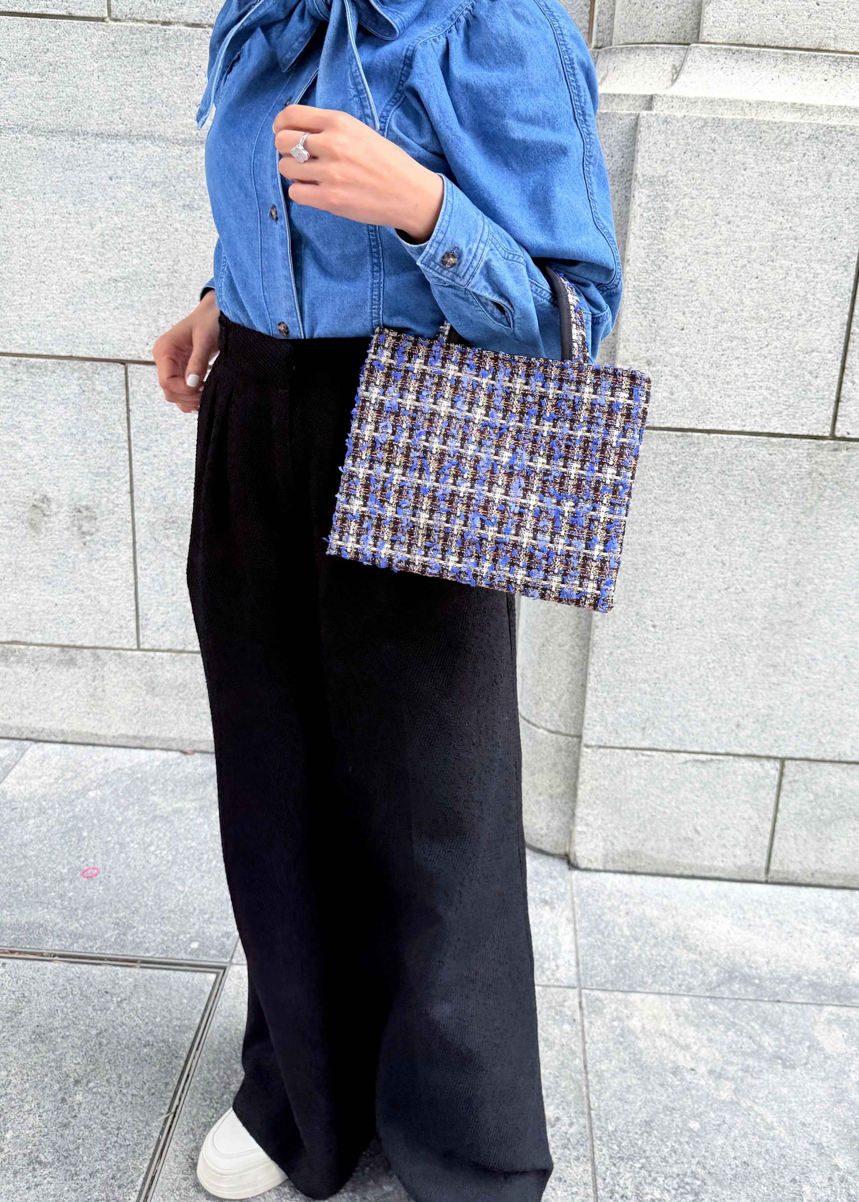blue、Black、Whiteがメインのインディゴブルー。スラリットモールがヒラヒラと可愛く、絶妙に織り込まれたラメ糸やアクセントになる暖色の糸も美しい日本製のファンシーtweedです。毛羽感は控えめで、年中使える風合い。女性らしいMINIはいつものコーデにアクセ感覚で投入していただけます。