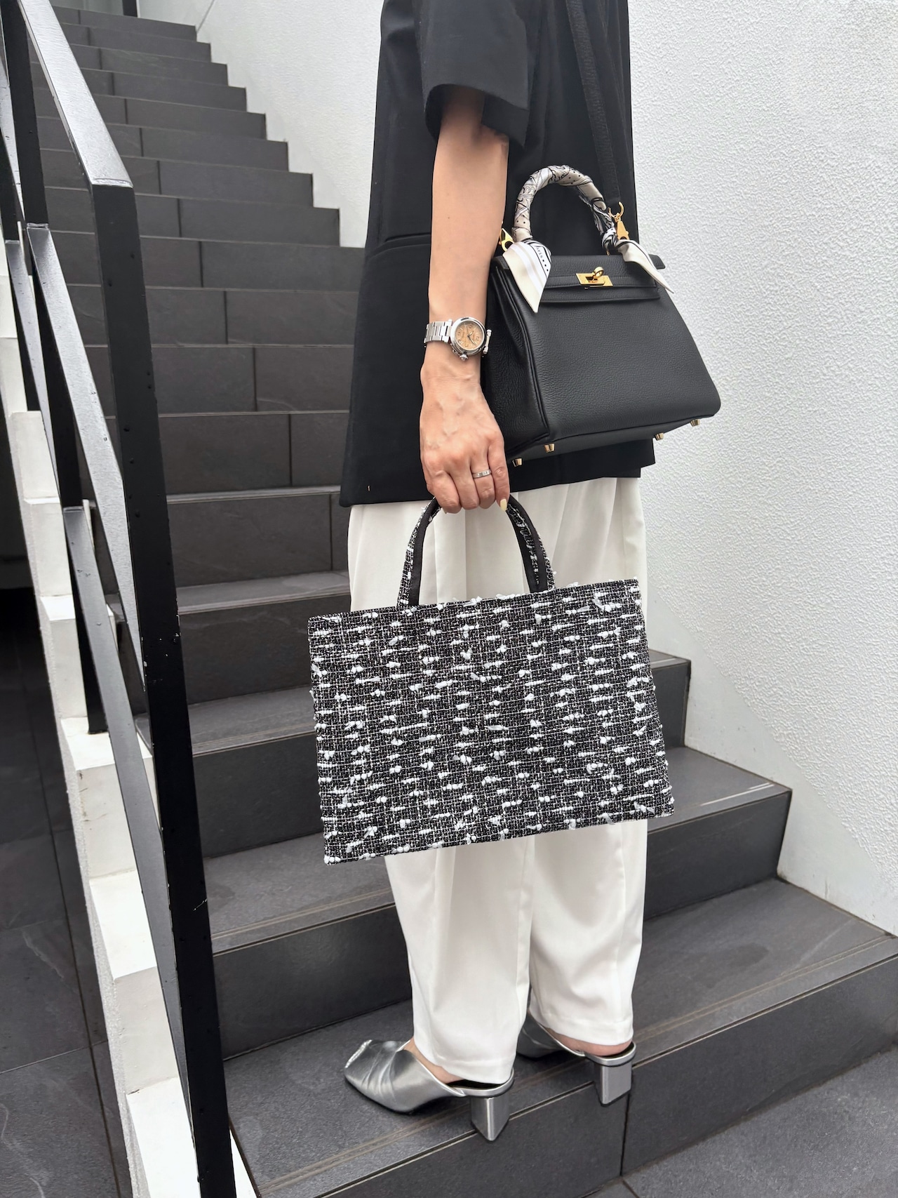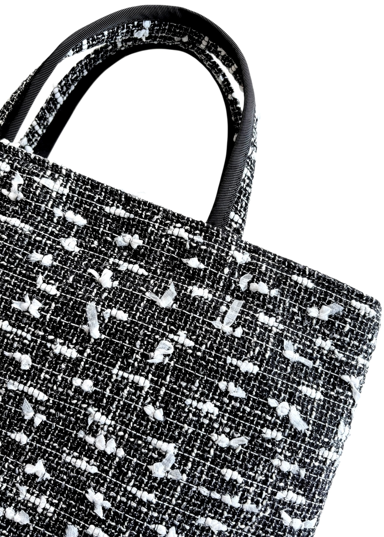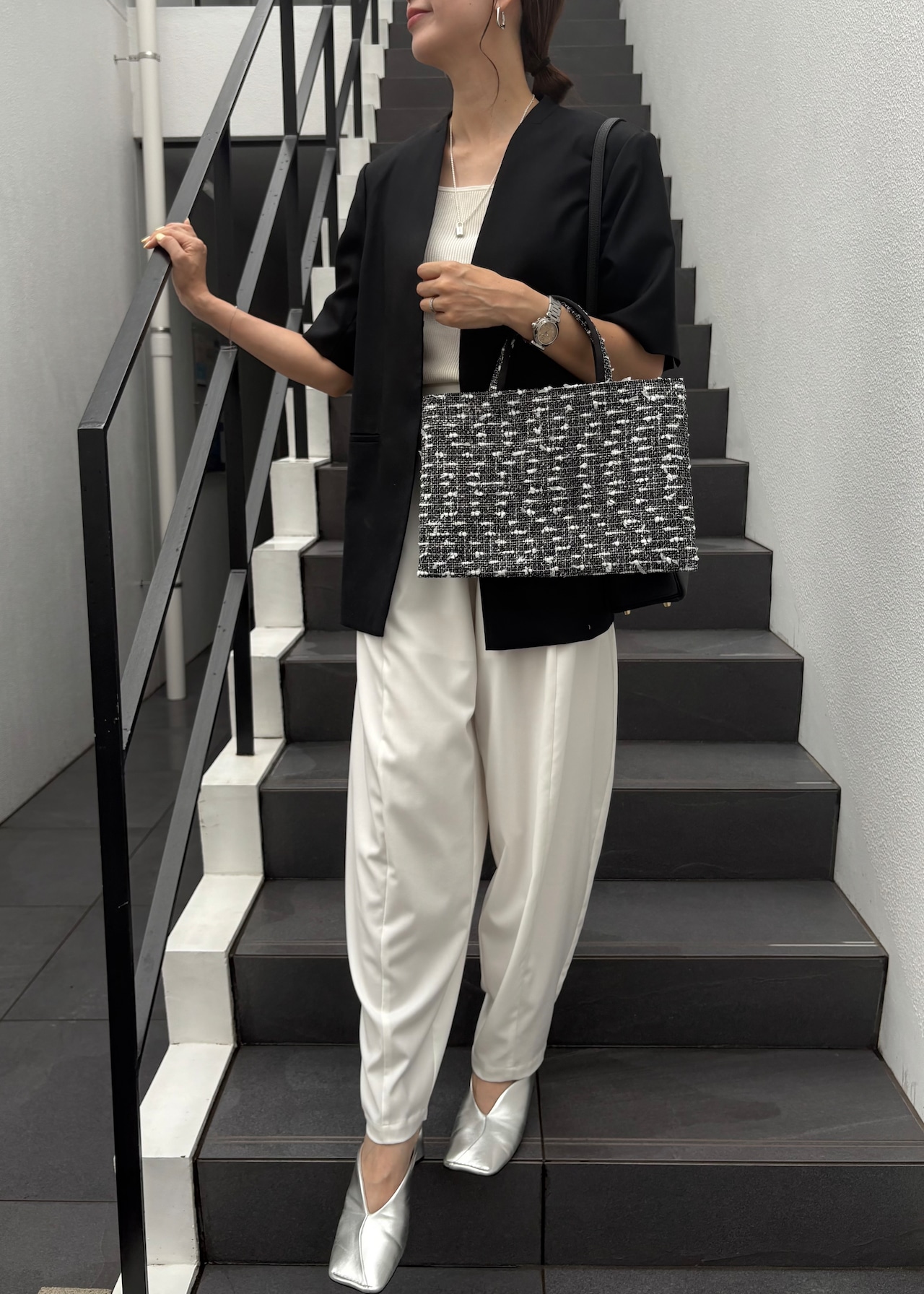 Black×Whiteのモノトーン。ヒラヒラと可愛いリボンヤーンとモールがエッジをきかせてくれているファンシーtweedは、どんなスタイリングにも取り入れやすくエレガントにもかっこよくも持っていただけます。